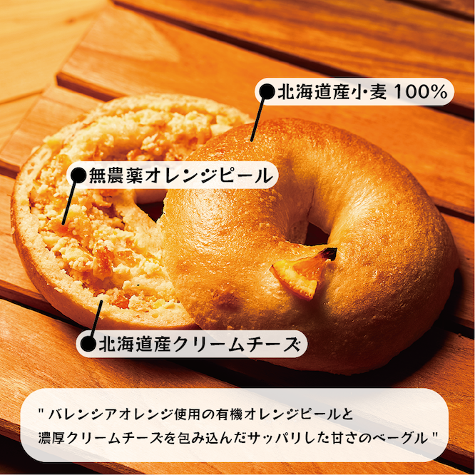 無農薬のオレンジピールと北海道産の生乳で作ったクリームチーズを混ぜ合わせたオレンジクリームチーズをたっぷり包み込みました。爽やかなオレンジピールと濃厚なクリームチーズのマリアージュが絶妙!朝食にもぴったりです。※忙しい朝にも手軽に食べられるので、ぜひお試しください。