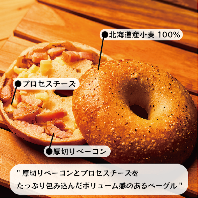 朝食にオススメ!「ベーコンチーズ」 "厚切りベーコンとプロセスチーズをたっぷり包み込んだ ボリューム感のあるベーグル