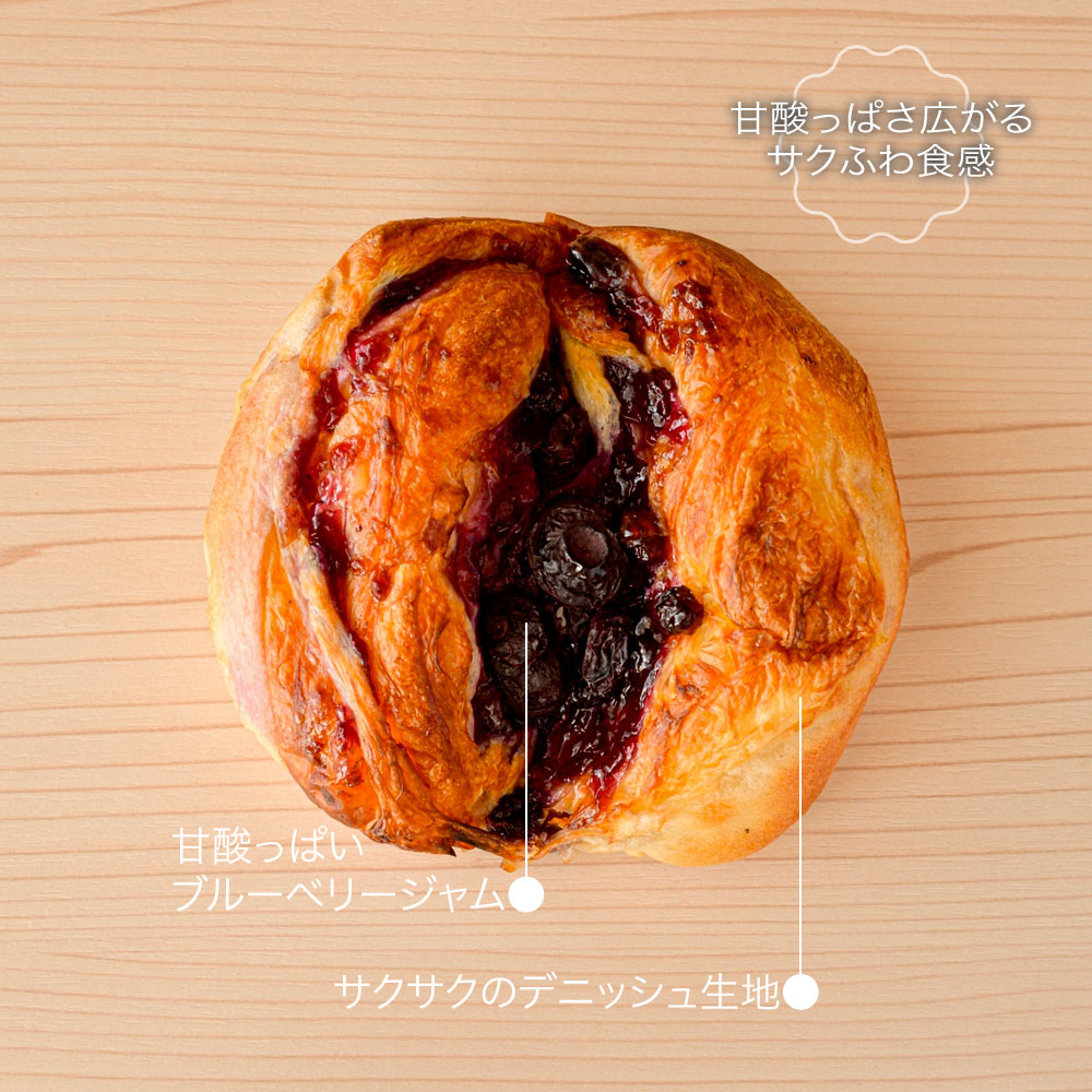 ベーグル生地にサクサクのデニッシュ生地を重ねて、甘酸っぱいブルーベリージャムをたっぷり包みました。